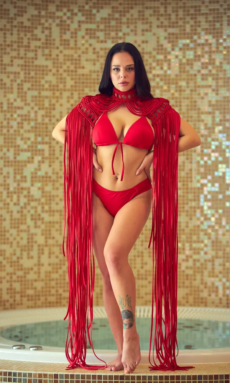 Horný diel bikín SUE vyniká netradičným ozdobným prvkom – exkluzívnym macramé, ktoré je zhotovené z lesklého jemného saténu. Táto ručne vyrábaná aplikácia elegantne lemuje líniu dekoltu a dodáva celému modelu nádych luxusu a ženskosti.