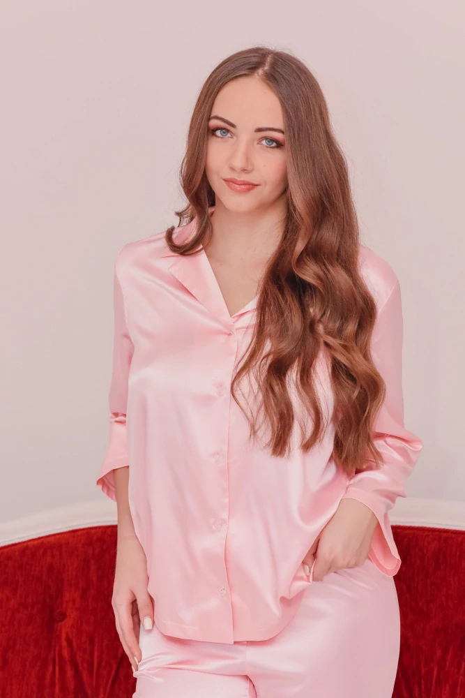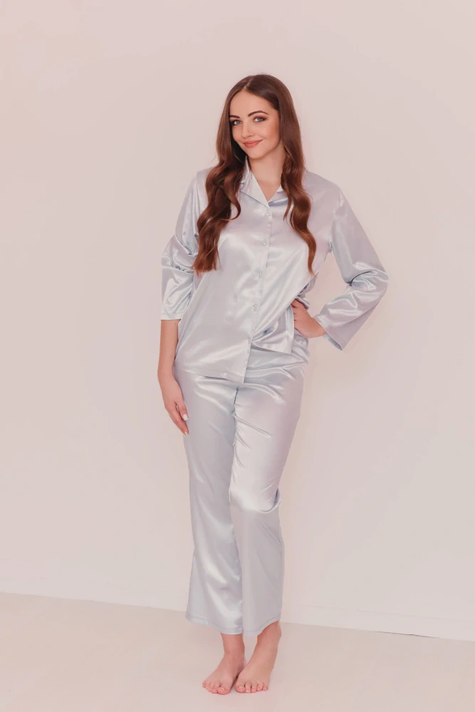 Toto elegantné dámske pyžamo je vyrobené z hladkého pololesklého saténu najvyššej kvality, čím nadväzuje na dlhoročnú slovenskú tradíciu výroby luxusného textilu. Príjemný materiál ladne splýva po tele a poskytuje výnimočný komfort.